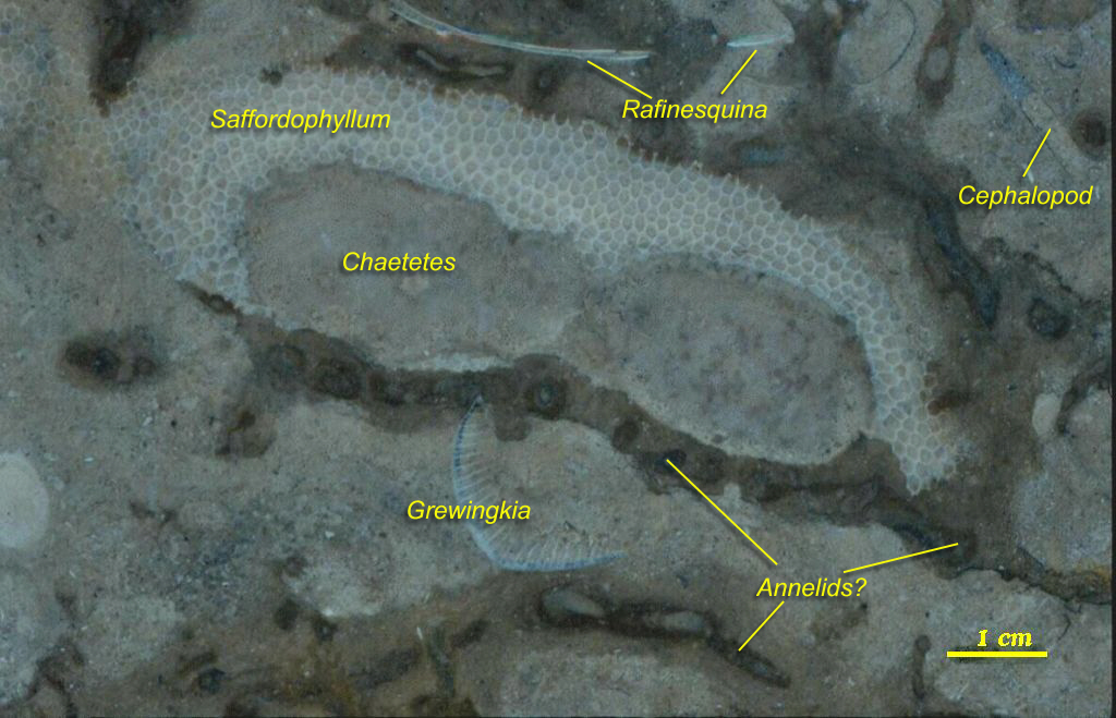 Chaetetes, Saffordophyllum, Grewingkia,Rafinesquina, Annelids?, CephalopodLab Slab B