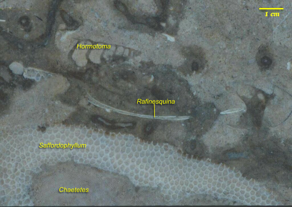 Chaetetes, Saffordophyllum, Rafinesquina,HormotomaLab Slab B