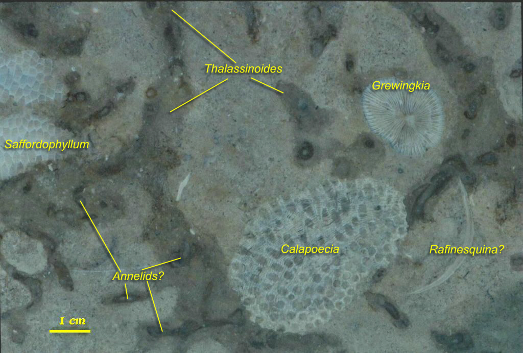 Calapoecia, Saffordophyllum, Rafinesquina?Thalassinoides, Annelids?Grewingkia showing very good horizontal section.Lab Slab B
